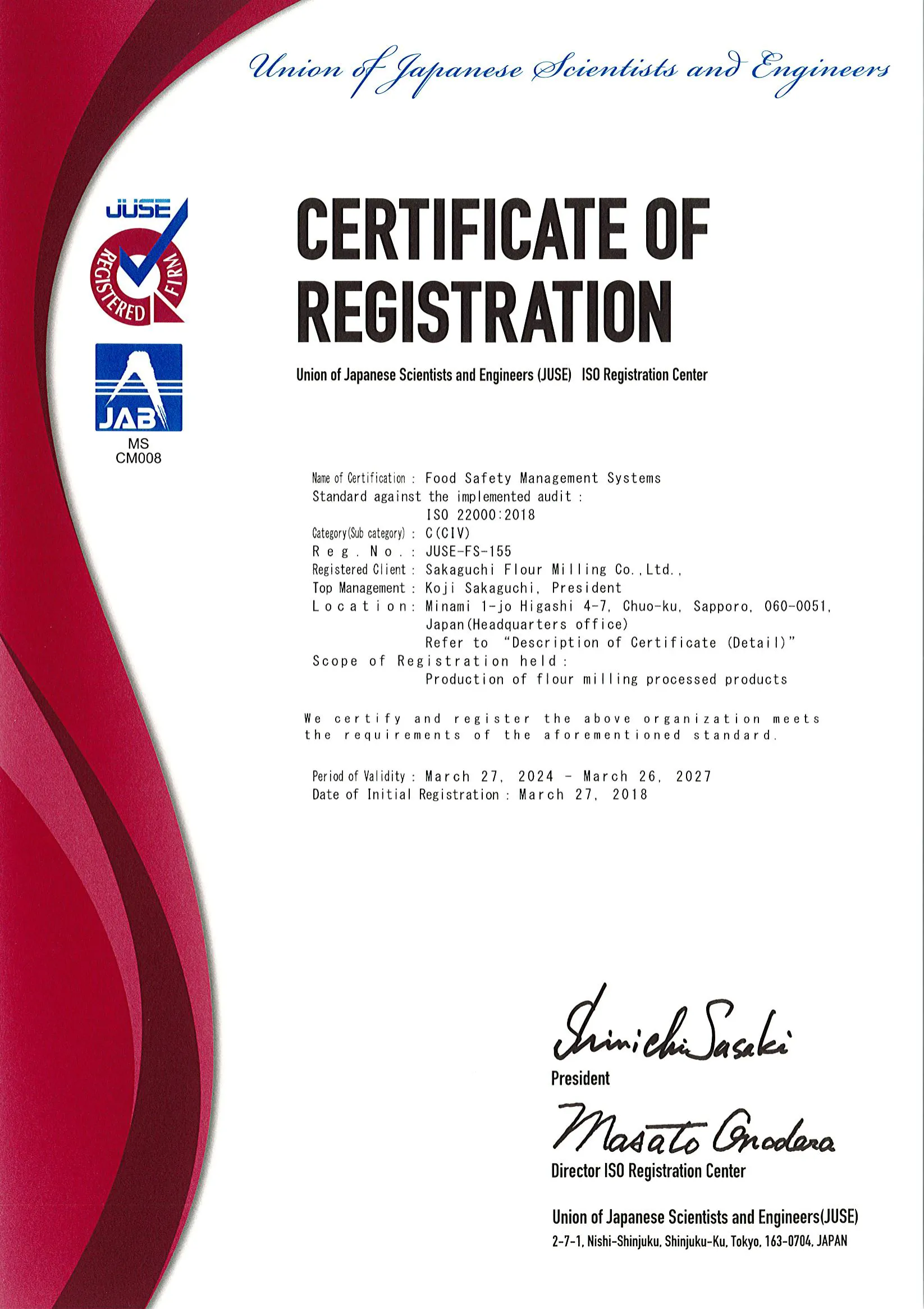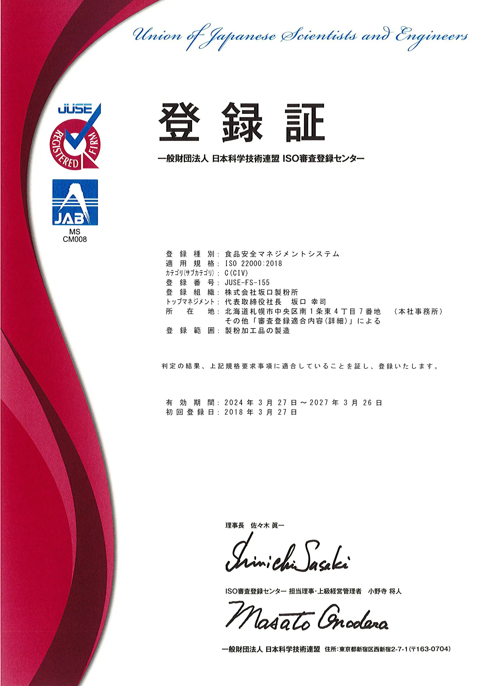 平成30年 ISO22000(食品安全マネジメントシステム)を取得